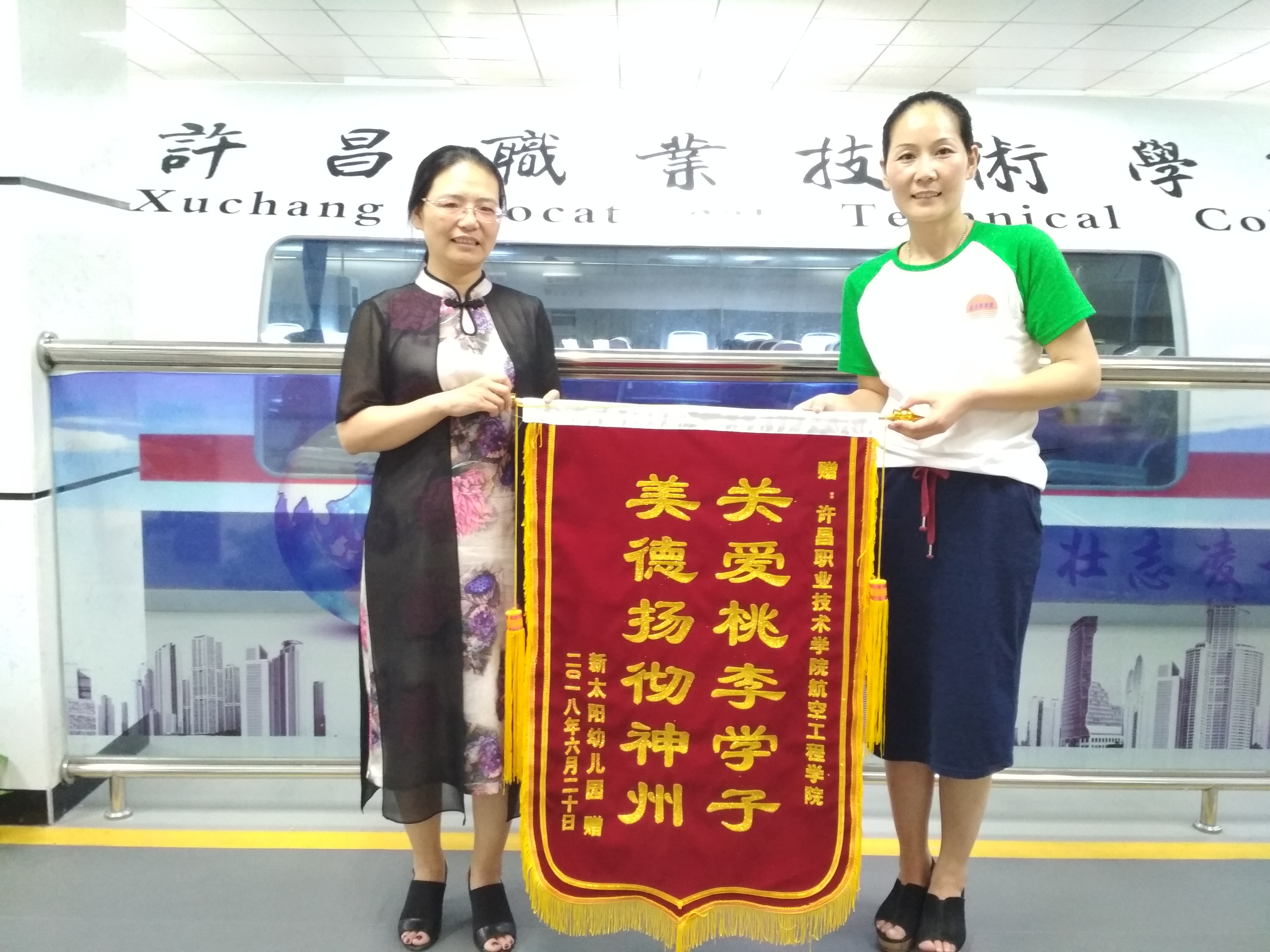 在航空服务中心,志愿者们身着航空制服,面带微笑,按照标准礼仪规范引导小朋友们依次体验了安检流程和客舱服务。在飞机模拟仓内,志愿者们向小朋友们详细讲解了乘机注意事项以及紧急逃生办法。尽管不是真的乘坐飞机,但很多小朋友还是一脸兴奋,整个模拟仓热闹非常。60名小朋友分两组进行参观体验,整个活动大约持续了40分钟,临走时,很多小朋友还显得意犹未尽。为感谢我院在此次科普活动中的大力支持以及科普基地在服务社会方面发挥的巨大作用,谢老师代表幼儿园专门向航空工程学院科普基地赠送了一面锦旗。