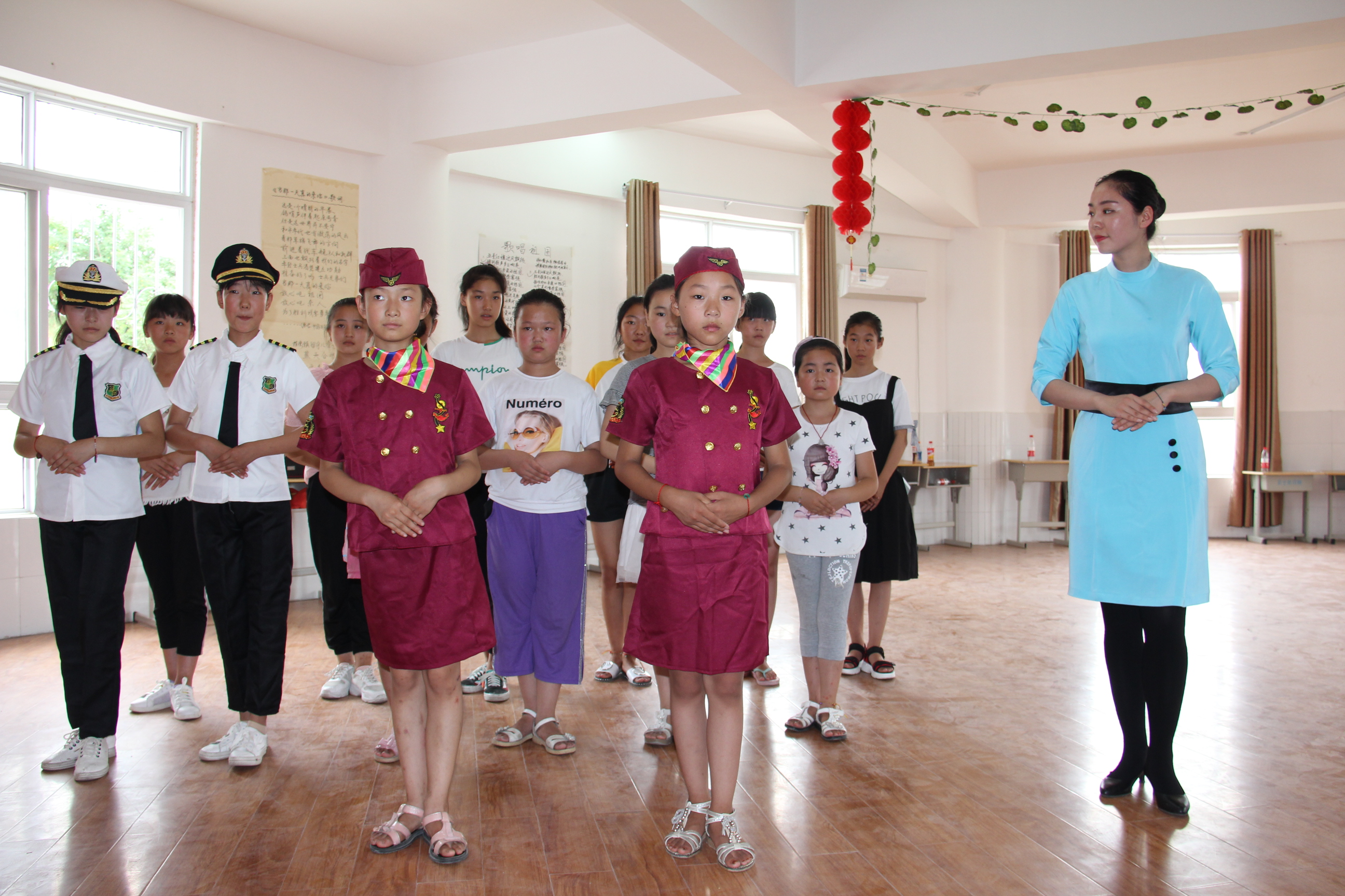 与此同时,其他留守儿童则在另两名服务队队员的指导下学习各种航空礼仪服务,其中4名留守儿童还穿上了队员们专门带来的航空制服。“右脚后撤,双手抚裙,坐,回正”,在两名队员耐心的指导下,这些留守儿童先后学会了航空服务礼仪中的站姿、坐姿、蹲姿、走姿,俨然一个个小空姐、小空少。