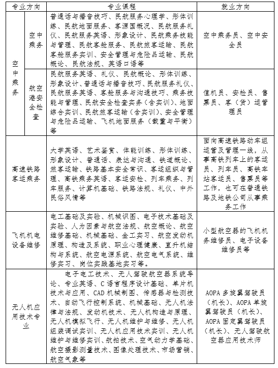 空中乘专业开设有空中乘务、航空港安全检查方向,空中乘务专业主要面向各航空公司、机场等企业,培养拥护党的基本路线,掌握空中乘务专业必备的基础理论和专业知识,具有良好的职业道德、职业精神、职业素养,具备空中乘务基本技能,有较强的实际操作能力,有较高的服务意识、创新意识和良好的职业道德和心理素质和身体素质,服务与民航客舱及机场地面相关服务等一线工作的德智体全面发展的高素质技能型人才。空中乘务专业按照“瞄准职业岗位→分析归纳岗位实际工作任务→确定行动领域→行动领域转化为学习领域”基本路径,构建了基于工作岗位需求的系统化课程体系。